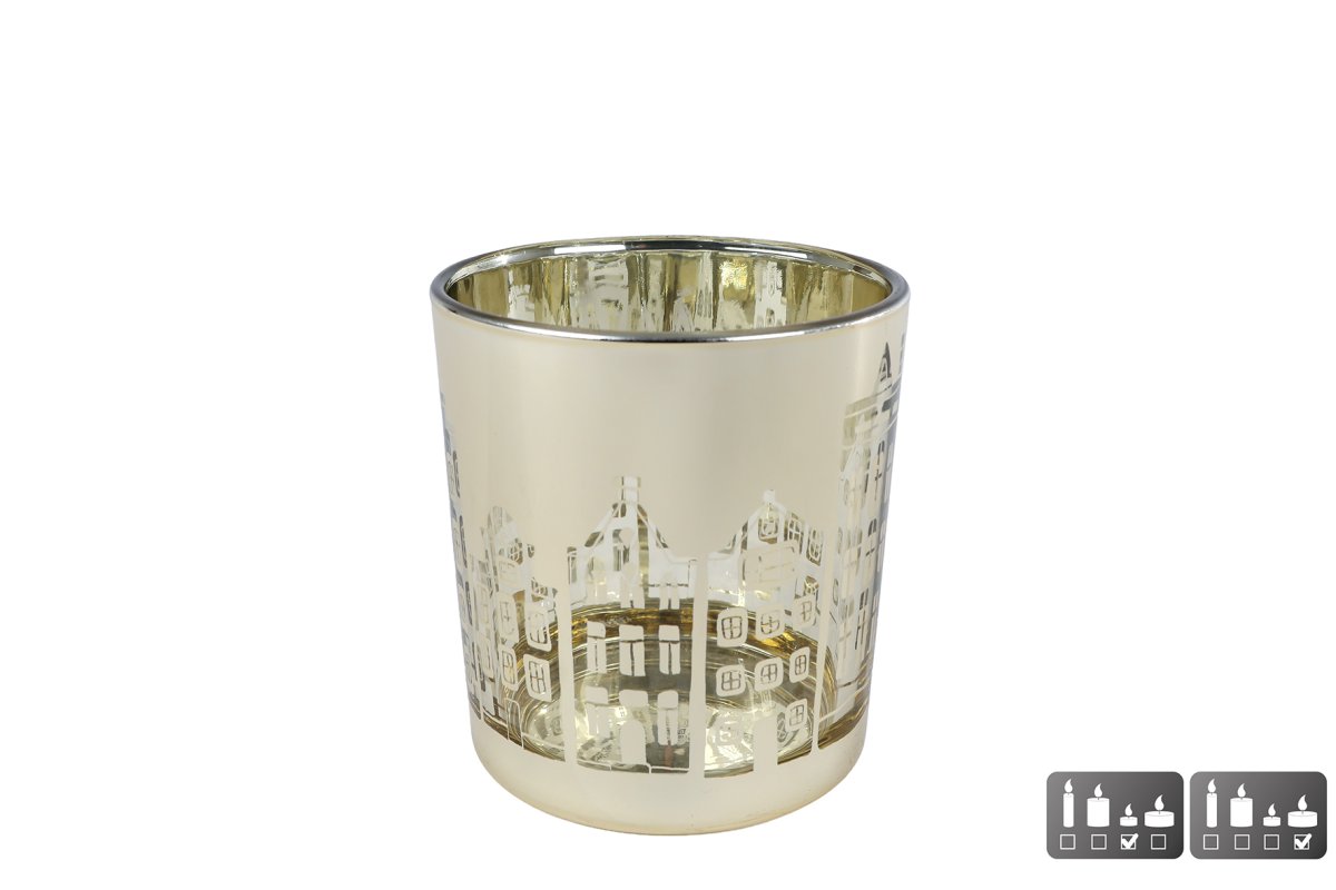 Theelichthouder Huisjes S goud glas 7,5x7,5x8cm